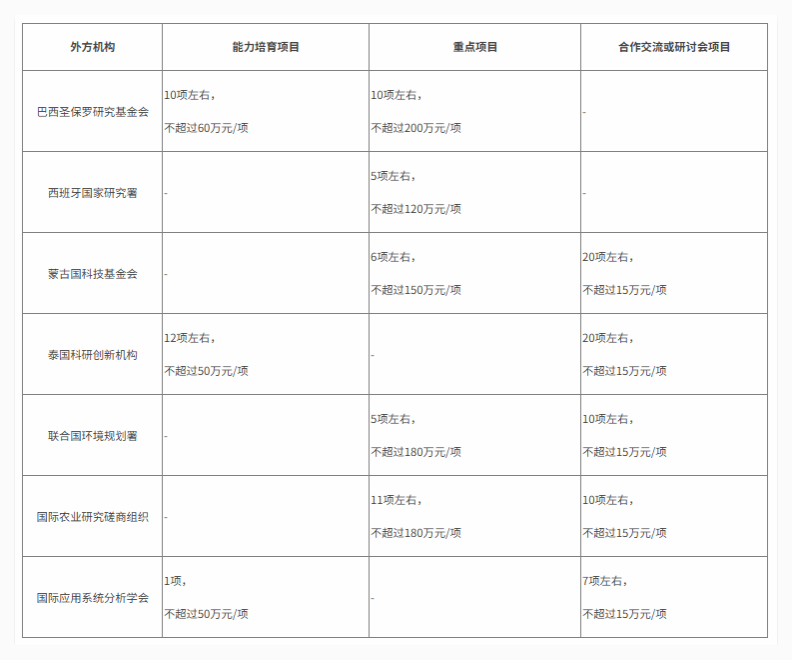 “能力培育项目”旨在支持中外科研人员培育合作关系,可开展包括合作研究、野外考察等多种形式的研究活动。“重点项目”旨在资助中外科研人员在选定领域开展合作研究,共同培养杰出科技人才和解决区域性科学问题,促进提升地区的科研水平与世界影响力。“合作交流项目”旨在支持中外科研人员开展能力建设,可开展包括互访、讲习/培训班等多种交流活动。“研讨会项目”旨在支持中外科研人员召开在华会议及出国会议。